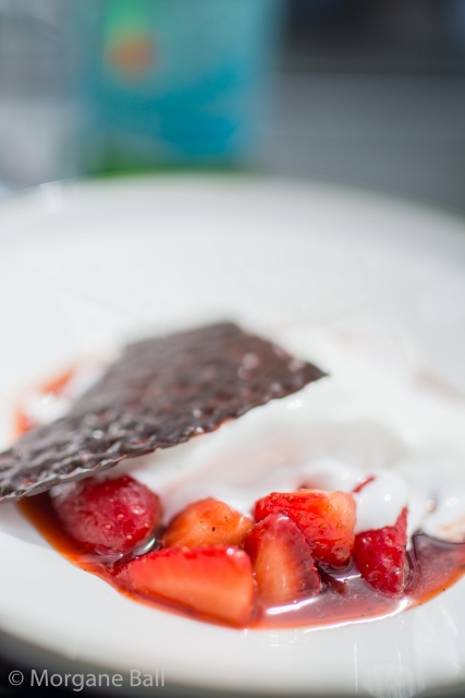 Cremoso di yogurt, fragole al balsamico e pepe, cialda dicacao.