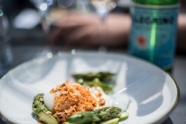 Uovo alla carbonara, asparago verde, pancetta, emulsione e crumble di Grane Padano