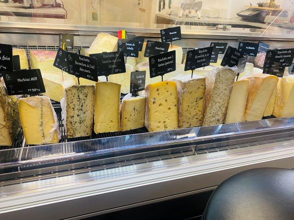 Fromages et spécialités maison : Brie de Meaux à la truffe des Cévennes (fait maison), Chèvre frais Bruchette (Altitude 190 – Chaumont Gistoux), Chèvre Désirée (Cardistel), Samson aux fleurs ( Samson, Namur), Cru des Rochettes (Vincent Counasse, Stoumont), Tomme de Lisbelle (Rochefort), Régalis Cézar (Pyrénées), Schlossberger (Suisse).