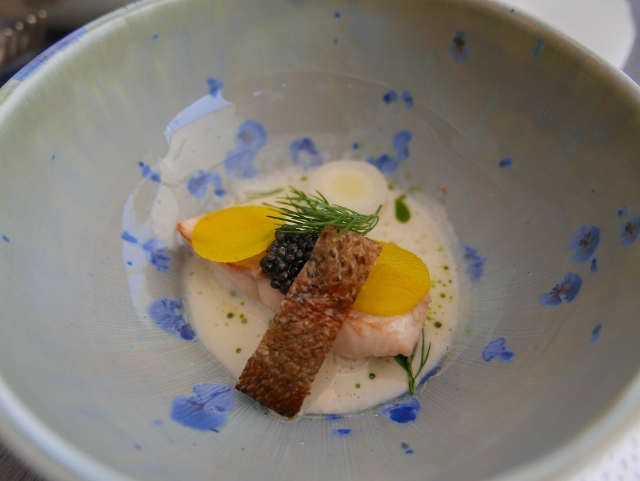 Ingrédients pour 4 personnes : 1 truite de 1kg, 2 poireaux, 1 cuillère de crème de Raifort, 2 dl de crème 35%, 1 pamplemousse jaune, 1 pamplemousse rose, 1 citron combava, 30 g de caviar, 50 g de beurre, 5 dl de vin blanc, 1 dl de vinaigre blanc , 1 échalote, fond blanc, sel et poivre, aneth, cerfeuil.