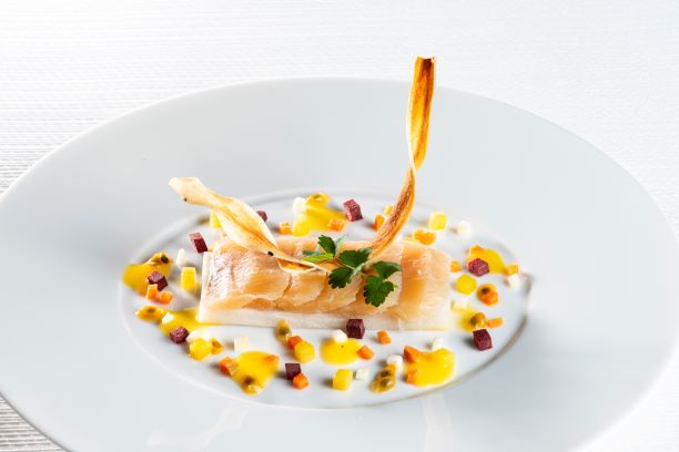 Dressage : placez les filets de truite au centre de l’assiette. Disposez la brunoise de fruits et légumes d’hiver tout autour en alternant les différentes couleurs. Ajoutez la vinaigrette de façon harmonieuse.