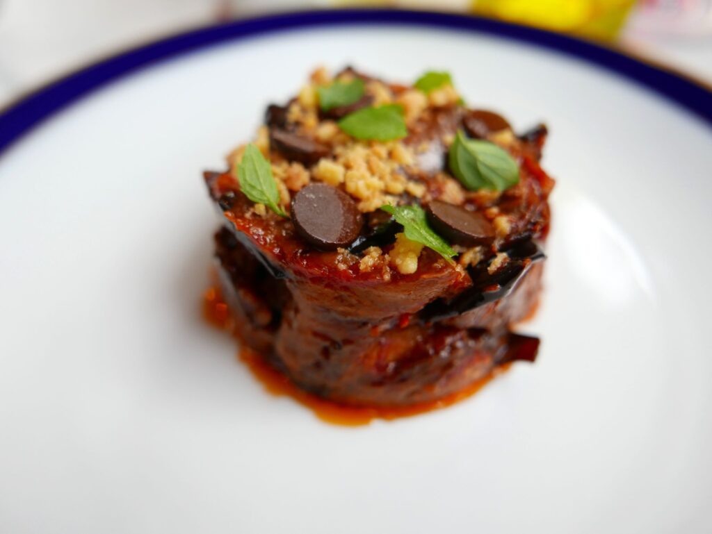 Ensuite, en entrée « signature », un gâteau d’aubergine violette de Sicile au chocolat et menthe.