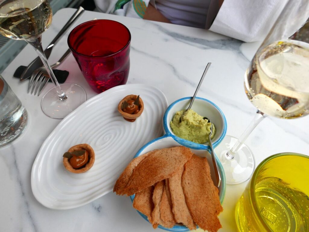 Lors de notre visite, Maria nous a proposé un menu débutant par quelques mises en bouche créatives : dont une tapenade de fèves vertes, mini-tartelette anchois, focaccia maison au levain.